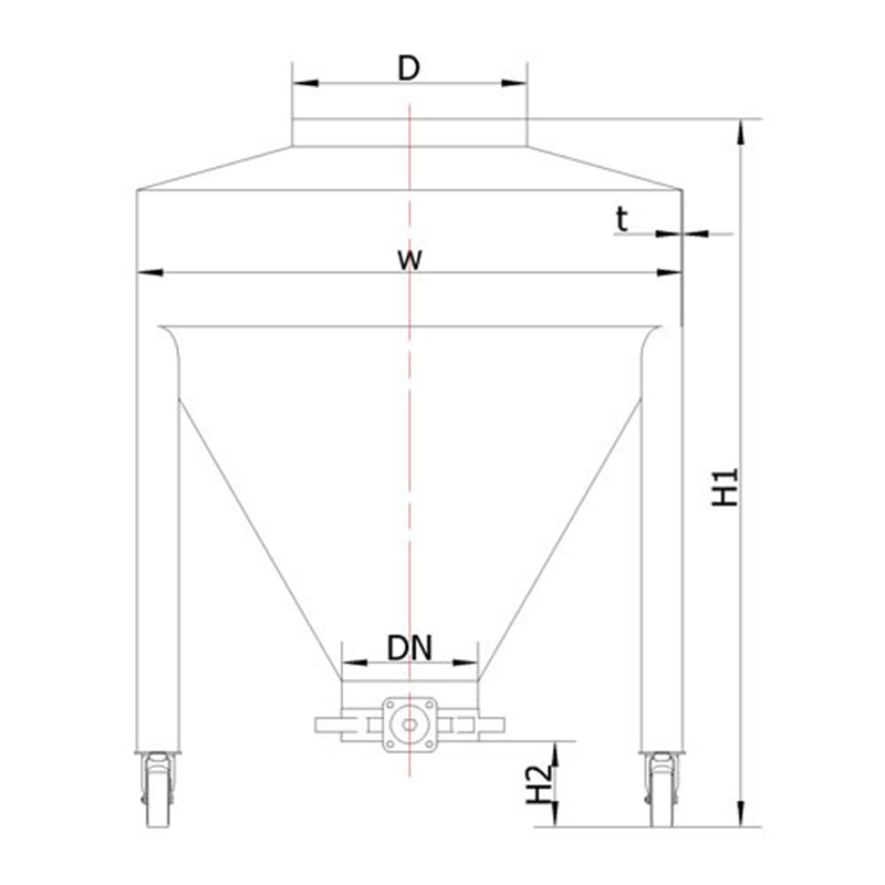 The external shape is either a square silo/hopper with rounded corners and a conical bottom or a circular silo/hopper. All corners adopt arc transitions, ensuring no dead ends, no material residue, and an aesthetic appearance.